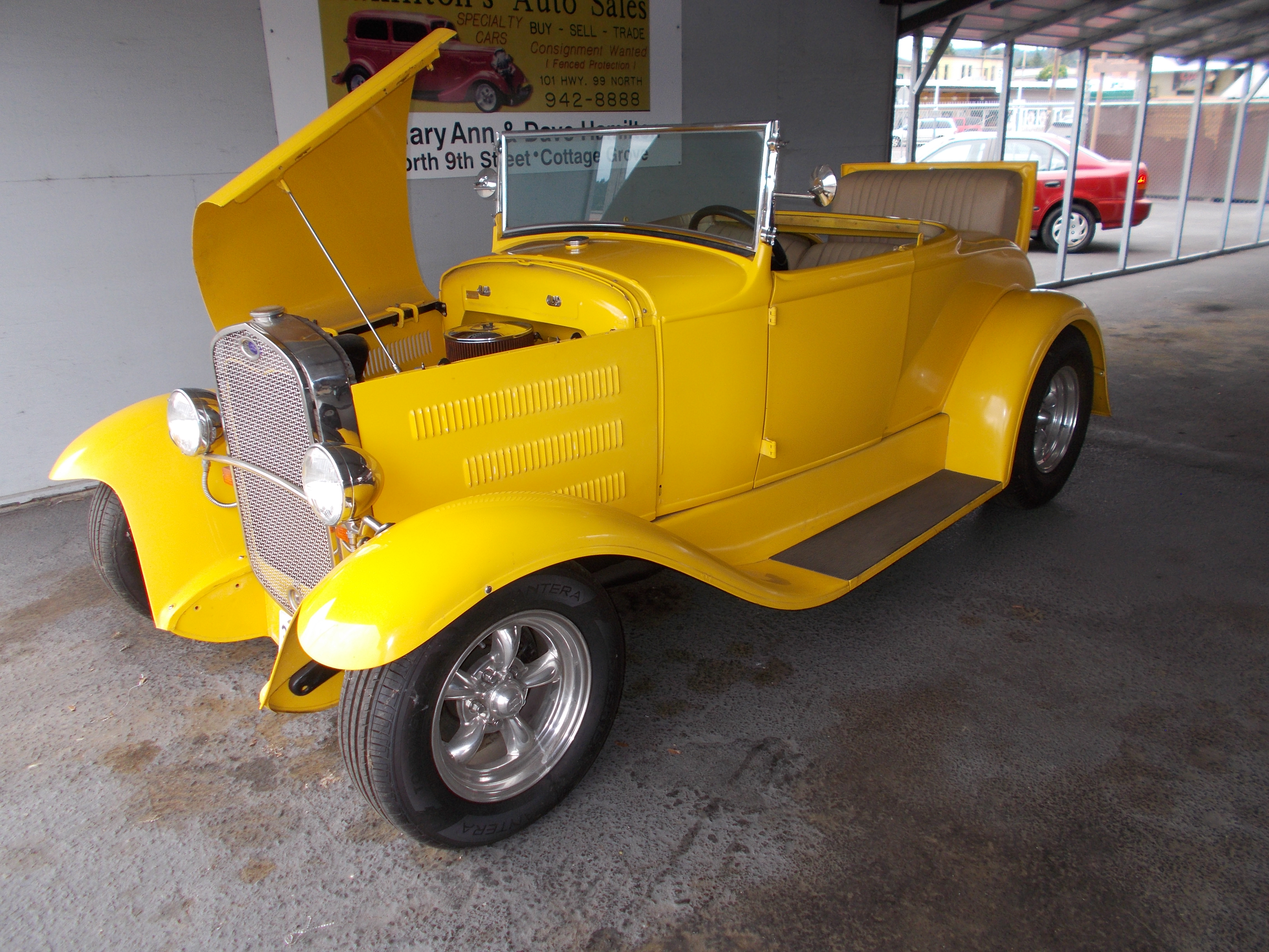 Speedster, Titled as 1927 Ford but all rebuilt Model-A other then 27 cowl. Custom built with only 1,127 miles since completed. Complete rebuilt custom 4cyl. model-A motor - New pistons, Manley stainless steel valves (larger intake valves), New valve springs, one piece valve guides, Mallory Distributor, Redline touring cam, Winfield head 7.5 -1 ratio, Winfield side cover, New babbited rods, New oil pump, Crank shaft counter weighted and balanced, 32 ford water pump, Custom exhaust and down draft intake with custom adjustable main jet Stromberg 97 carb. Has Model-A frame and running gear - Transmission rebuilt, Lowered suspension, After market adjustable friction shocks, Rear end gone through. Body is 1928 radiator, custom built hood and 1927 cowl w/custom windshield. Custom Model-A head lights, Turn signals, All custom wood back. This Speedster has lots of power and can cruise 60 MPH. # A-1968 $12,500 NOW! $10,950 SOLD!
