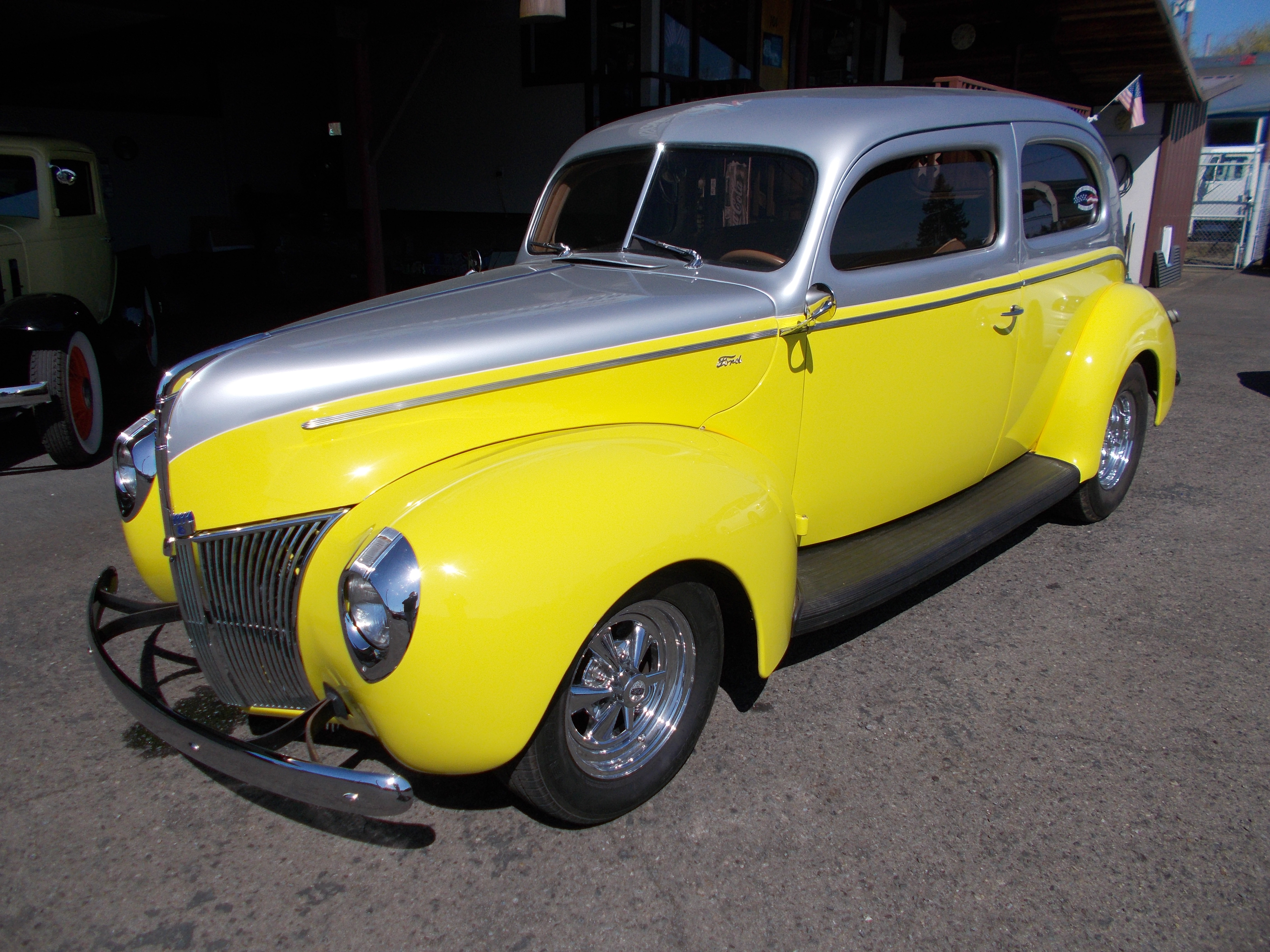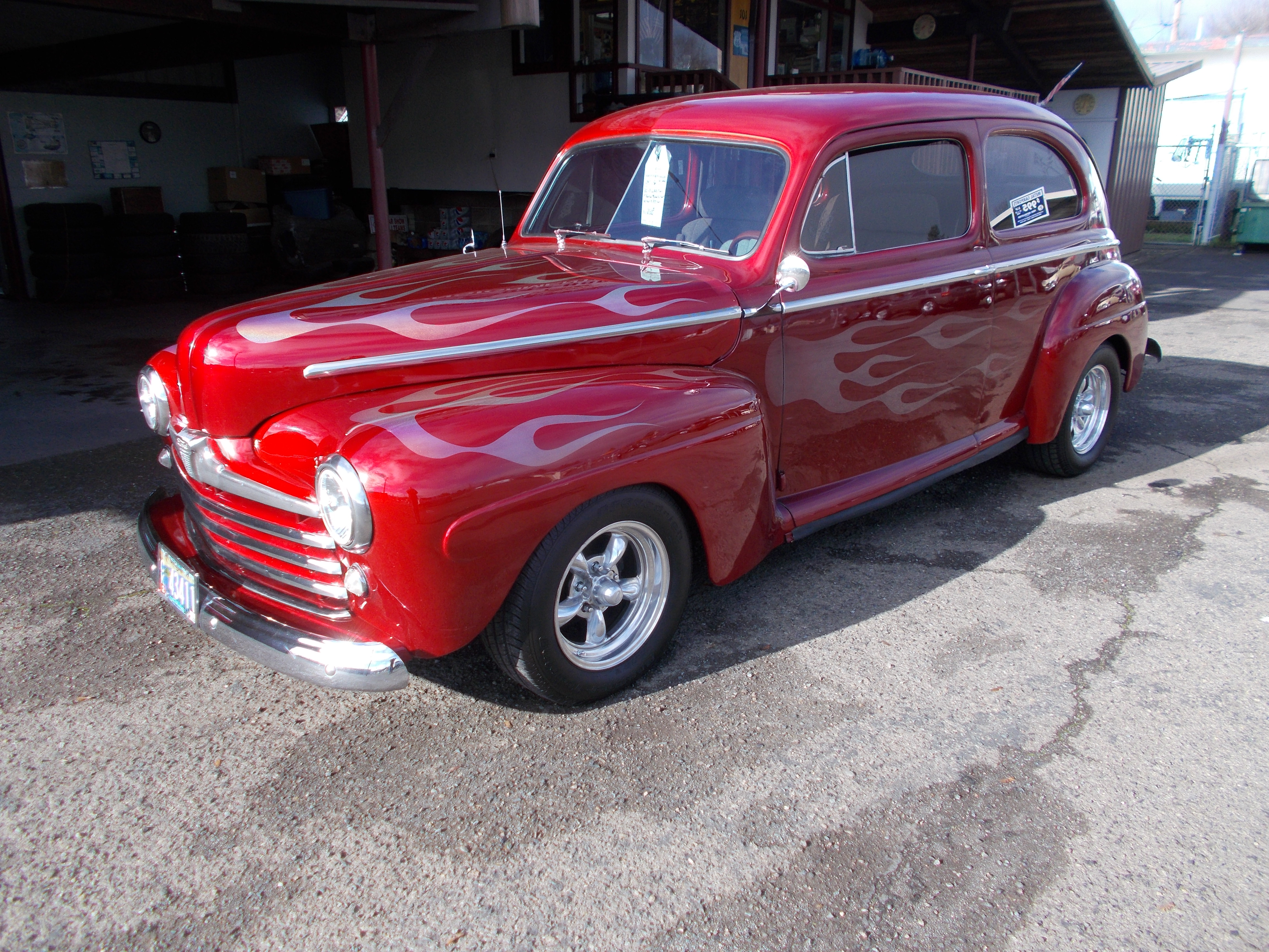 1940 Ford Opera Coupe, Steel car with Columbia rear end. Nice older restoration. Flat Head V-8, 3spd. transmission and Columbia rear end. Fuel tank and lines new. Body is solid from top to undercarriage with no rust problems, Doors fit car at the bottom as good as I have seen. Paint is older but looks very good - not perfect. All chrome and stainless excellent. Newer original style interior very good condition, All gauges, wipers and heater are working. Radio is there but dose not work. This car runs, drives and shifts excellent and Columbia rear end works proper. If you want a nice and solid 40 Ford this car is ready to cruise! # A-2046 $29,500 SOLD!