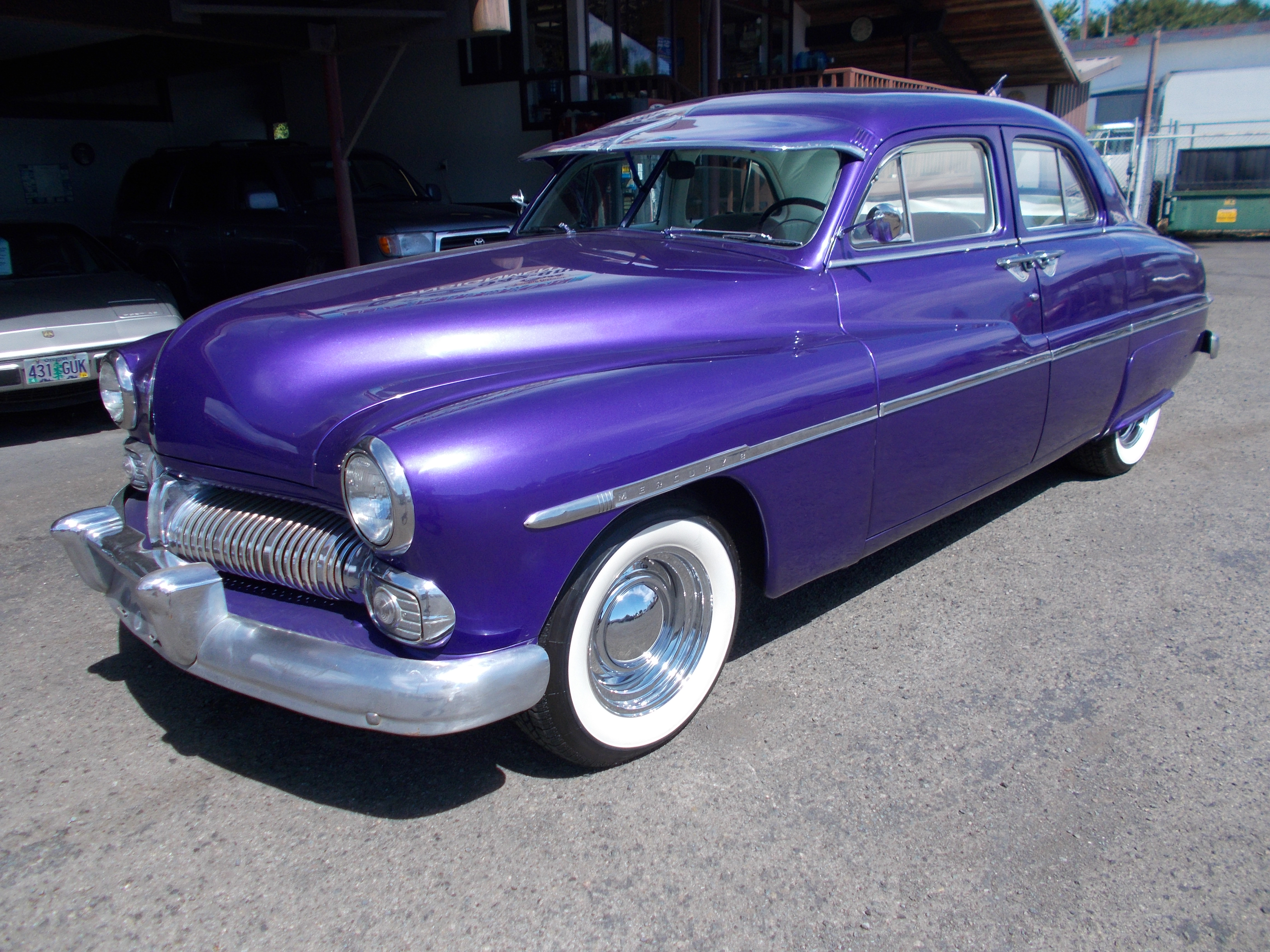 1950 Mercury 4dr. Sedan Street Rod. 350 V-8, turbo 350 Automatic. Good straight and solid body with nice paint. Not a rusty car ever. Interior was done in all white vinyl. The last owner put 08 Escape power bucket seats in with center console shift. Still have the original front seat in excellent condition and original shifter that can go with the car. Chrome and stainless good condition the bumpers are straight but chrome is original and just fair condition. Wide White radial tires. Runs and drives out excellent. # A-2192 $15,900 SOLD!