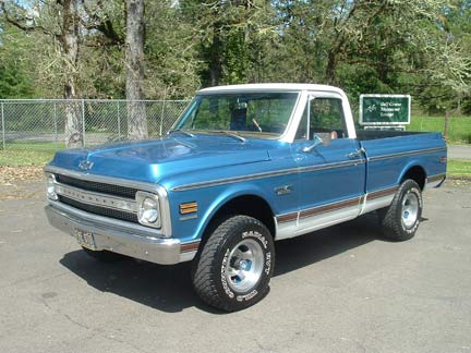 1970 Chevy C-10 Factory CST/10 Short Bed 4x4. This truck had the same owner past 38 years. 1 1/2 year ago he had it painted back the original color, Truck still had original paint and there where no rust problems other then just a little at bottom of rocker panels so they were replace the rest of truck solid original metal. All the stainless trim and light covers replaced. The grill surround and bumpers are original. All rubbers replaced. Truck came with factory bucket seat with center console, Factory tach works great. Factory A/C compressor removed but is available along with the original 350 motor. The interior is original other then he put 1972 door panels and window regulators. The bed has been Arma coated. The motor is a 350 V-8 rebuilt long block, the transmission was rebuilt at the same time and both have 6,764 miles on them. The odometer was reset at the time to read correct with motor and trans miles. When the motor was rebuilt they also added power front disc brake. This truck runs and drives excellent! Hard to find. # B-1699 $23,500 NOW! $21,500 SOLD!